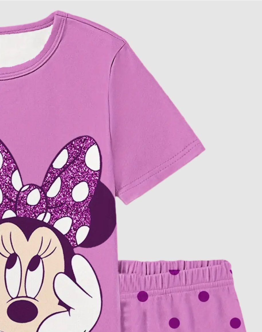 Minnie Maus & Katzen-Print Pyjama-Set für Mädchen – Flammenhemmender Stoff, Kurzarm-Shirt & Shorts mit Punkte-Design